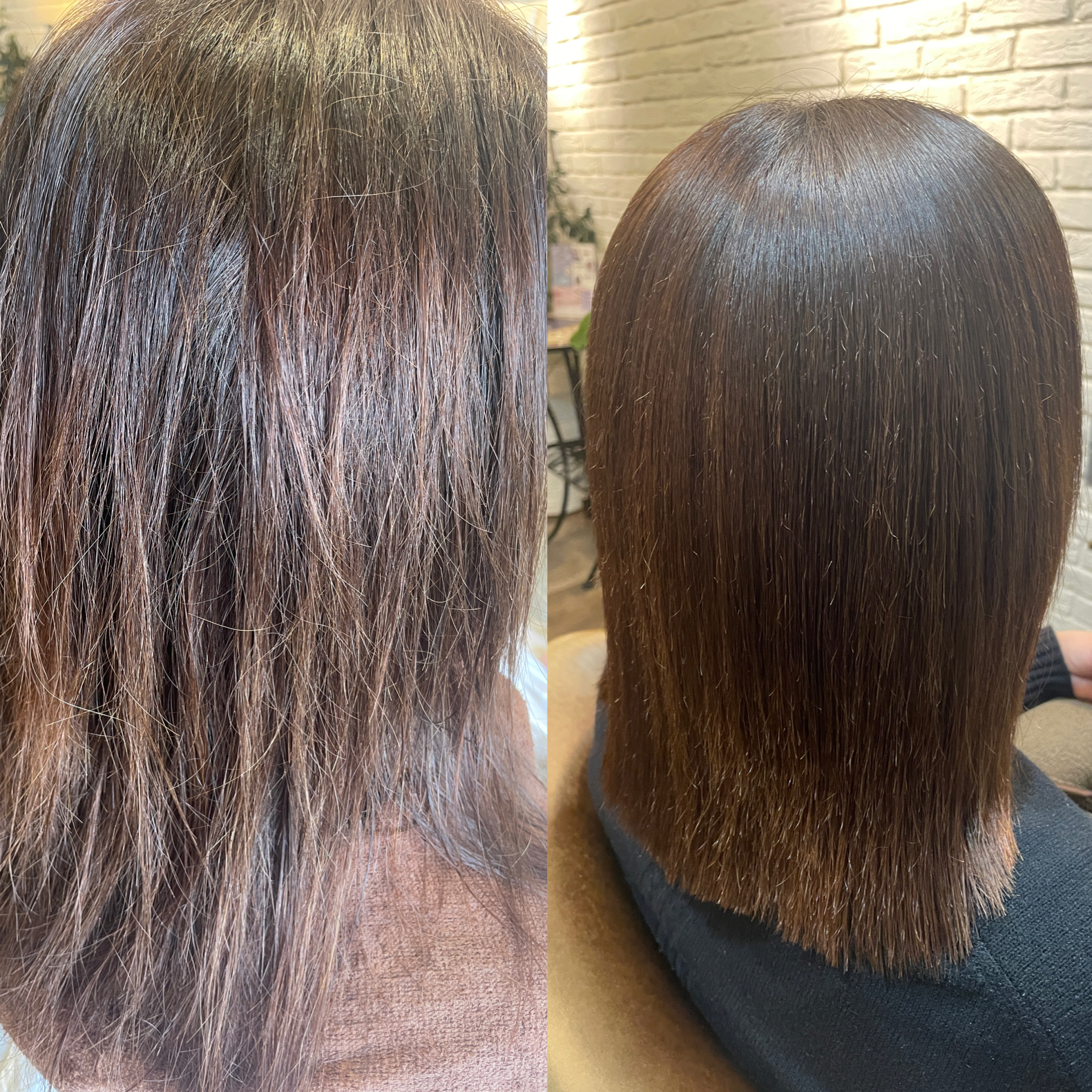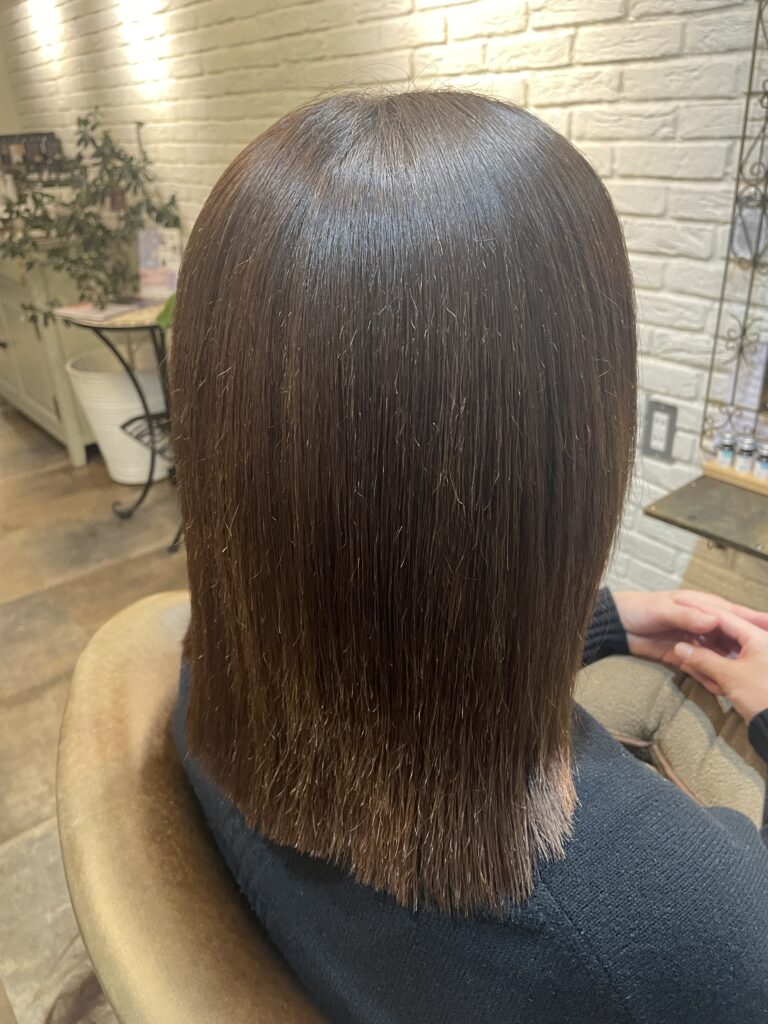 ※前のサロンでの強い薬剤の影響が毛先に少し残っていますが、今後は少しずつ切りながらさらなる美髪を目指していくことを確認しました。