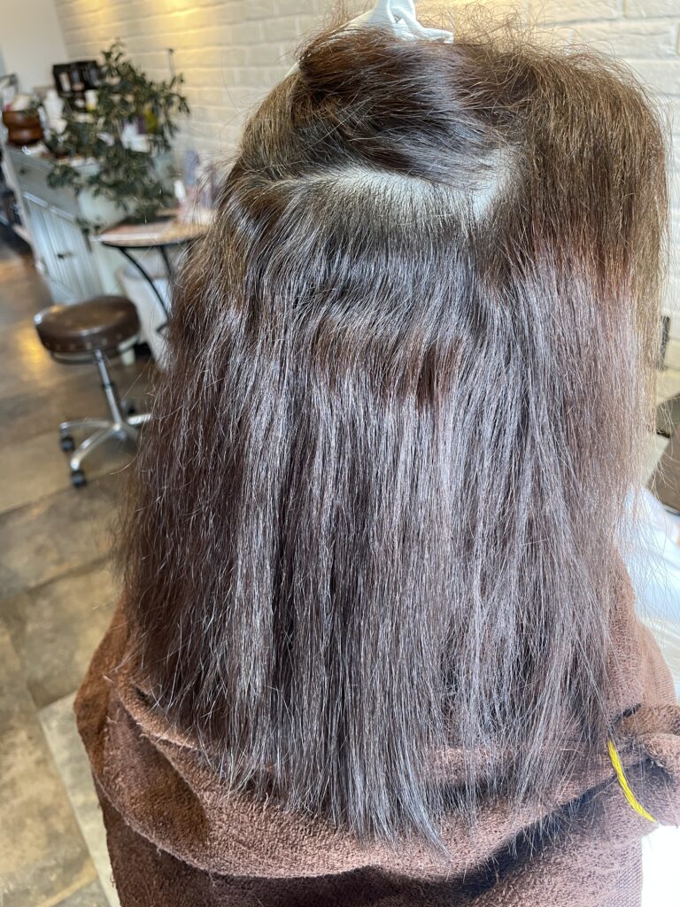 今回のビフォーは、乾燥によるパサつきと内部のうねりが重なり、まとまりにくい状態でした。このような髪に対して、強い薬剤で一気に伸ばしてしまうと、仕上がりが硬くなったり、逆にダメージを悪化させてしまうケースも少なくありません。